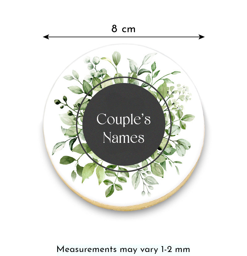 These personalised wedding cookies feature your names surrounded by a beautiful greenery wreath. An elegant favour to share on your big day.
