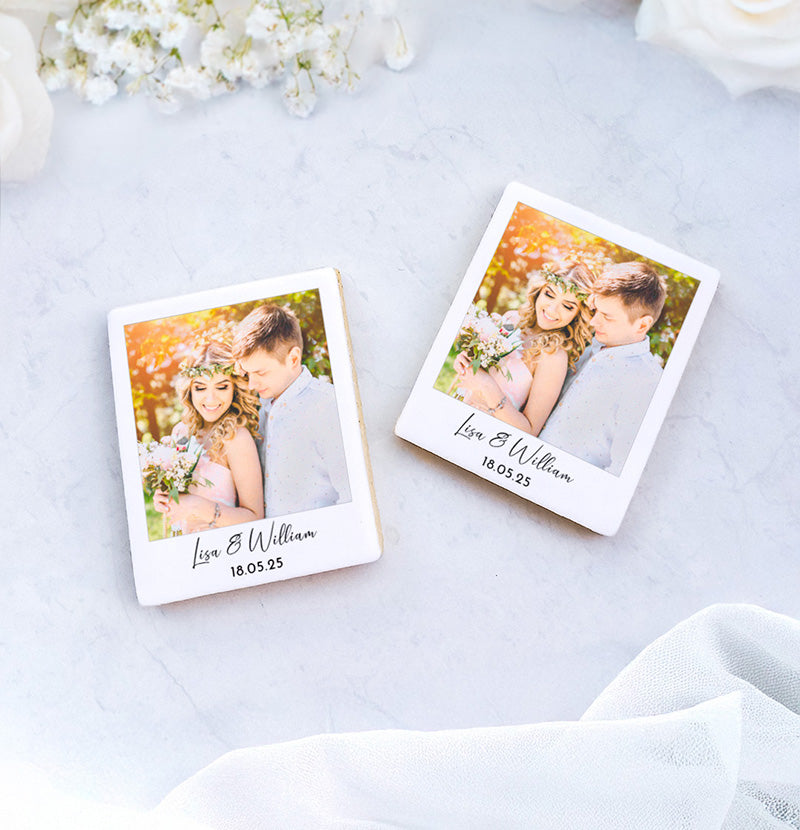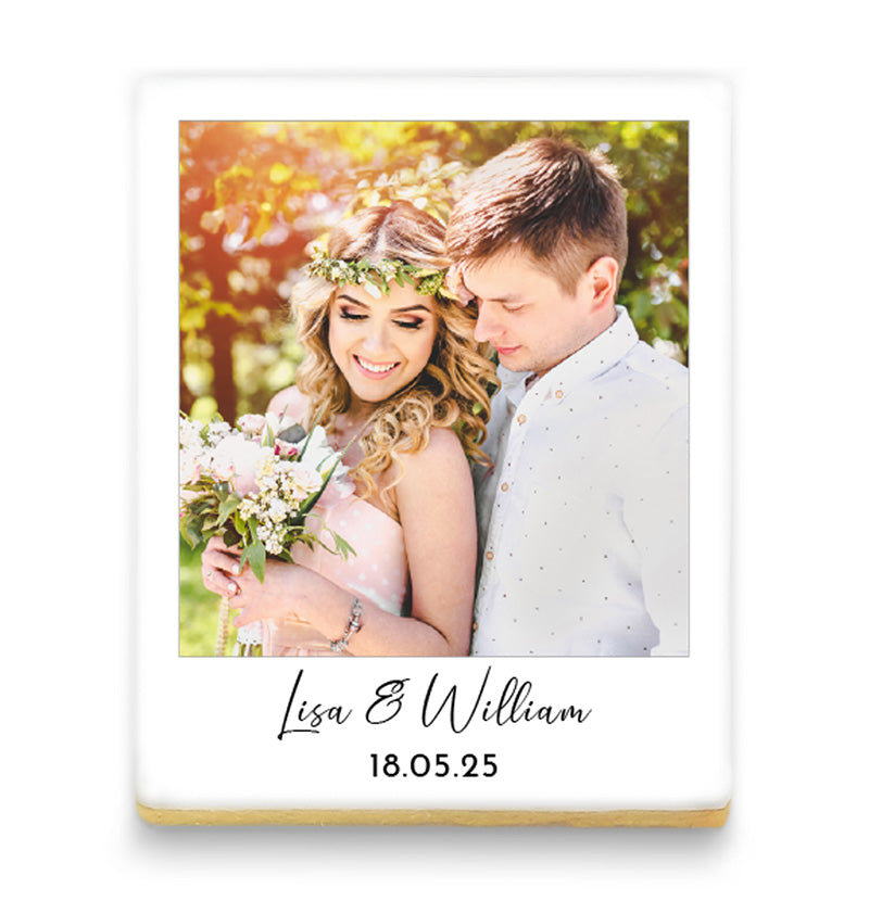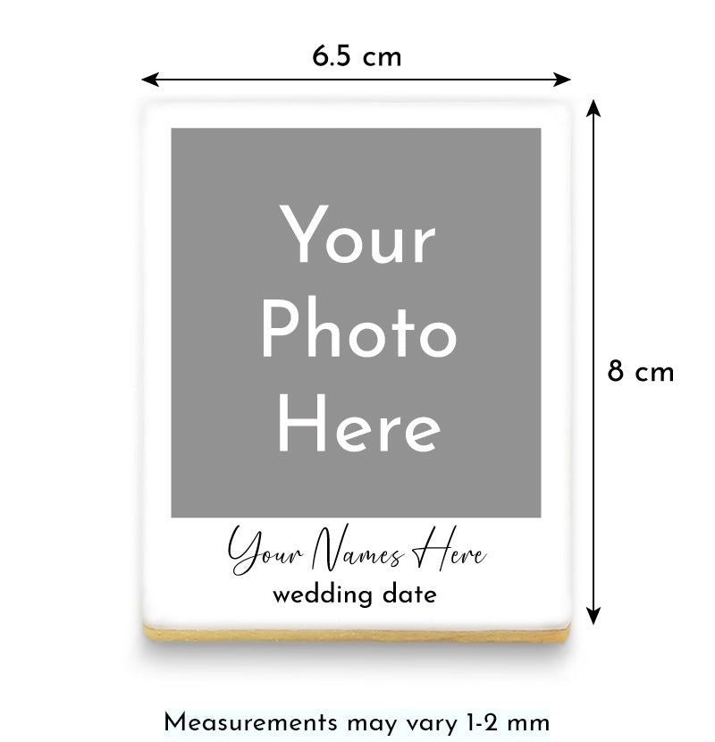Our Polaroid Photo wedding cookies are personalised with your favourite photo and message — a distinctive favour with your story.